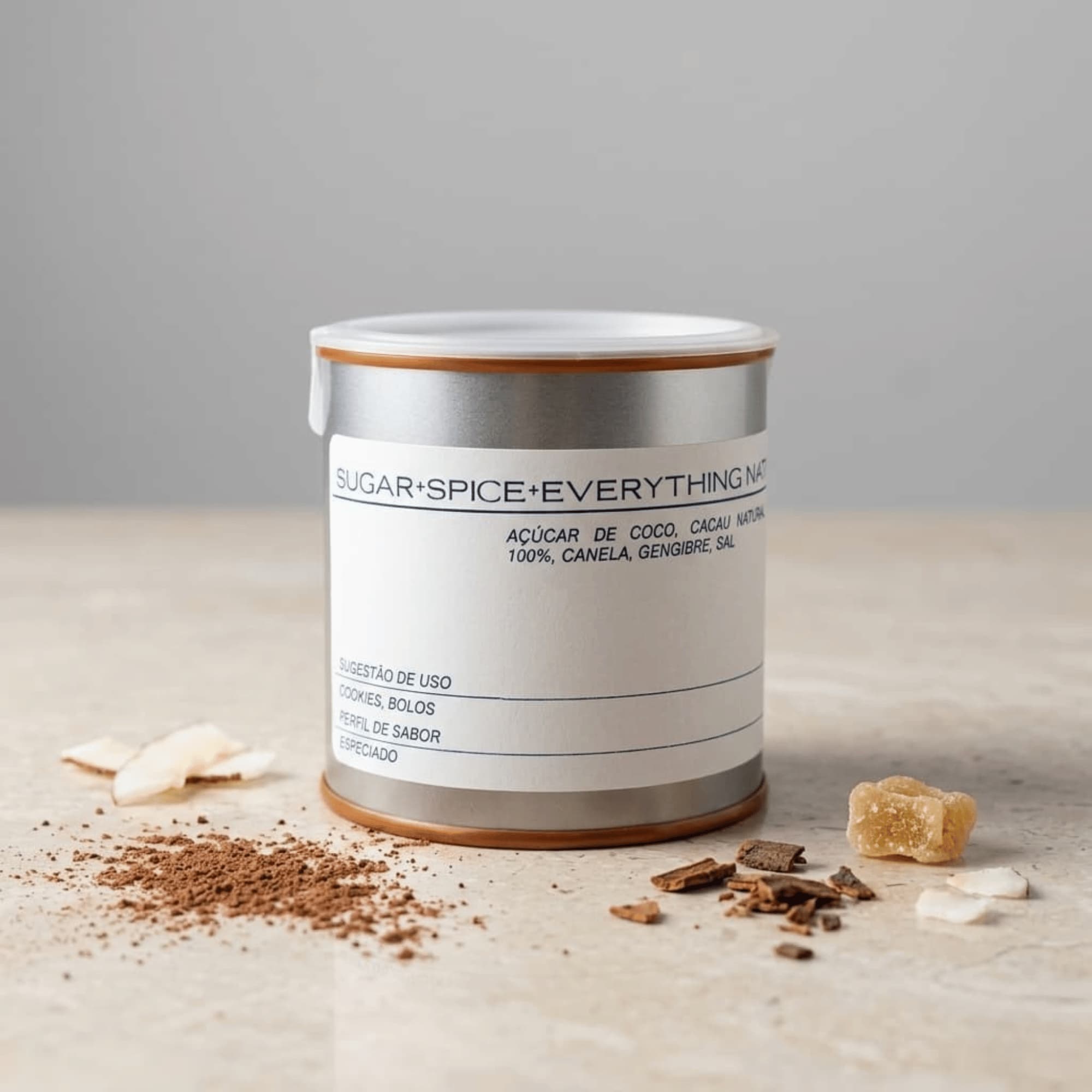 Ingredientes: Acúcar de Coco, Cacau Natural, Canela, Gengibre, Sal Fino.